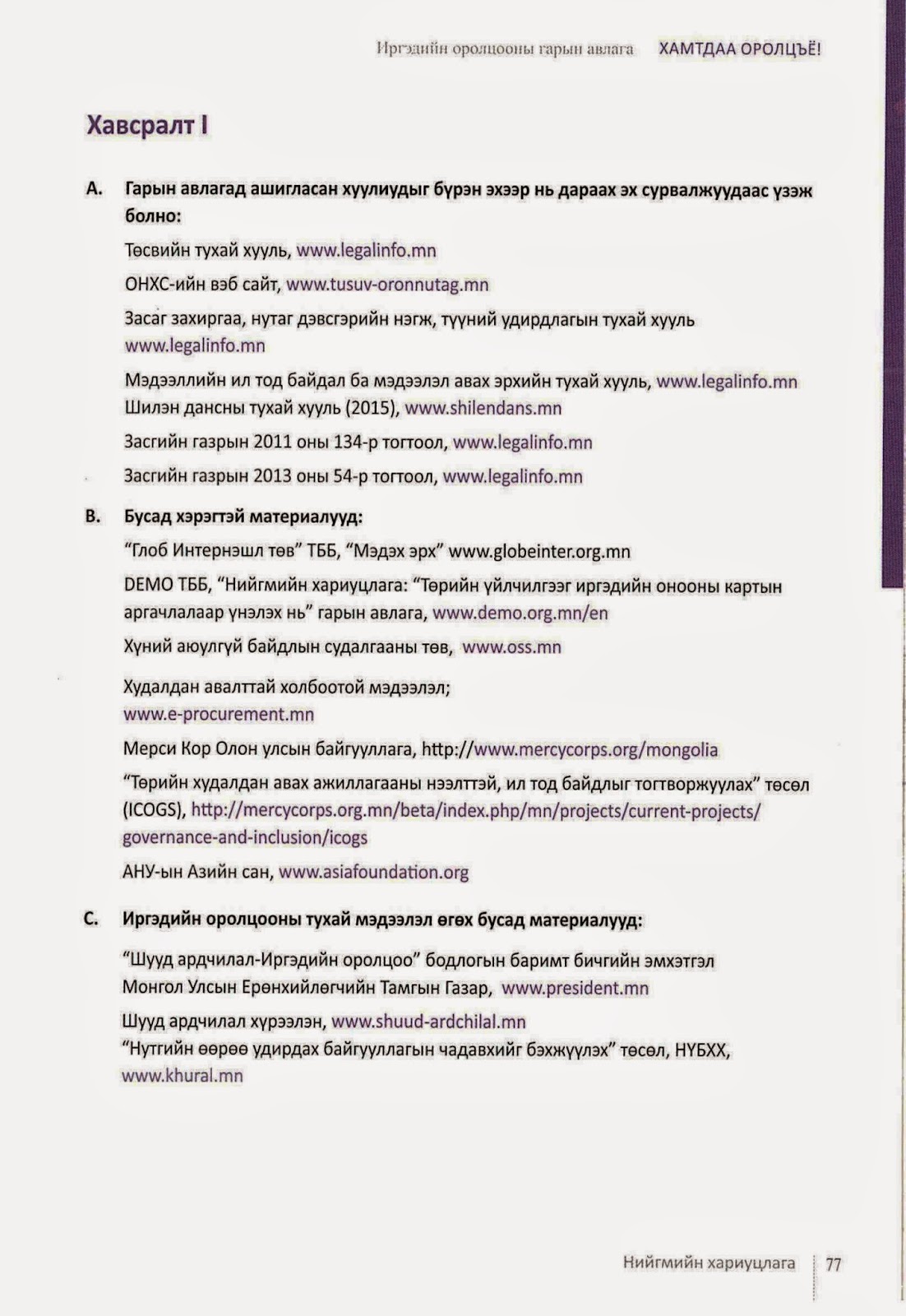 Иргэдийн оролцооны тухай олон гарын авлага, арга зүйн материалууд хэвлэгдэн олны хүртээл болсон боловч энэхүү гарын авлага нь орон нутгийн удирдлагын шийдвэр гаргахтүвшинд иргэдийн оролцоог хөгжүүлэх, үүний тулд иргэдэд иргэдийн оролцооны талаарх мэдлэг, мэдээллийг өгөхөд зориулагдаж байгаагаараа онцгой ач холбогдолтой юм. Нөгөө талаар Швейцарийн хөгжлийн агентлагийн санхүүжилтээр Монгол Улсын Ерөнхийлөгчийн Тамгын газар, АНУ-ын Азийн сан хамтран хэрэгжүүлж буй "Нутгийн удирдлагын түвшинд иргэдийн оролцоог дэмжих нь" төслийн хүрээнд хэрэгжүүлсэн ажлуудын туршлага, ололт амжилтуудад тулгуурлан гарч байгаа нь тэмдэглүүштэй юм.